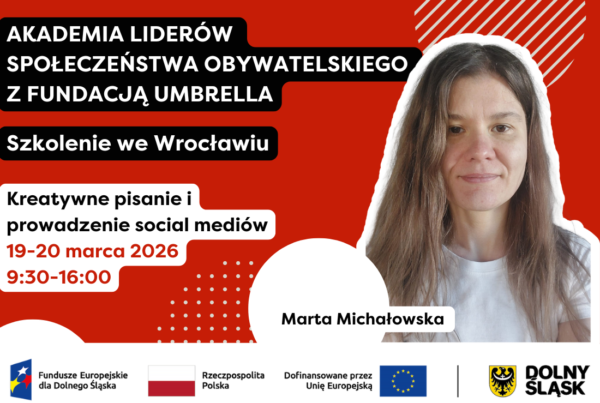 Weź udział w szkoleniu Komunikacja i marketing w NGO, które odbędzie się w ramach Akademii Liderów Społeczeństwa Obywatelskiego z Fundacją Umbrella już w piątek, 13 marca 2026 r. w godz. 10:00-16:30 w siedzibie Fundacji przy ul. Legnickiej 65 we Wrocławiu.  To świetna okazja, aby poznać praktyczne podejścia do budowania silnej komunikacji i skutecznego marketingu, które pomogą w realizacji misji organizacji pozarządowych i zwiększą ich wpływ na społeczność.