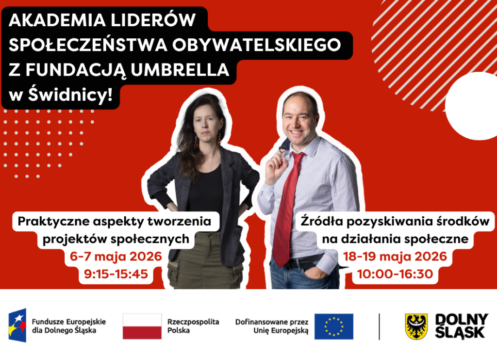 Szkolenia odbywają się w ramach projektu “Akademia Liderów Społeczeństwa Obywatelskiego z Fundacją Umbrella” współfinansowanego ze środków Europejskiego Funduszu Społecznego Plus w ramach programu Fundusze Europejskie dla Dolnego Śląska 2021- 2027.