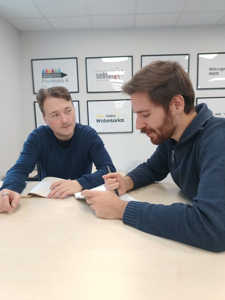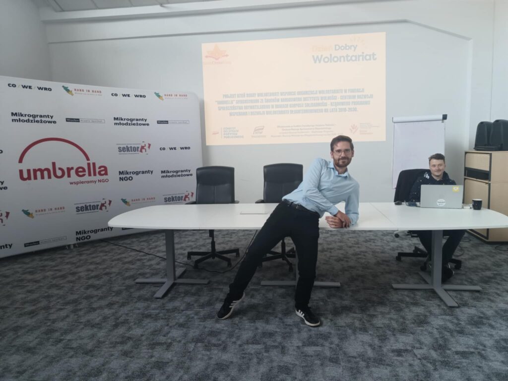 Zaczynał od wsparcia dla Ukrainy, potem pomagał w kawiarence językowej, a czasem nawet w pracach remontowych. Teraz wspiera nas w organizacji wydarzeń – niezastąpiony wolontariusz!